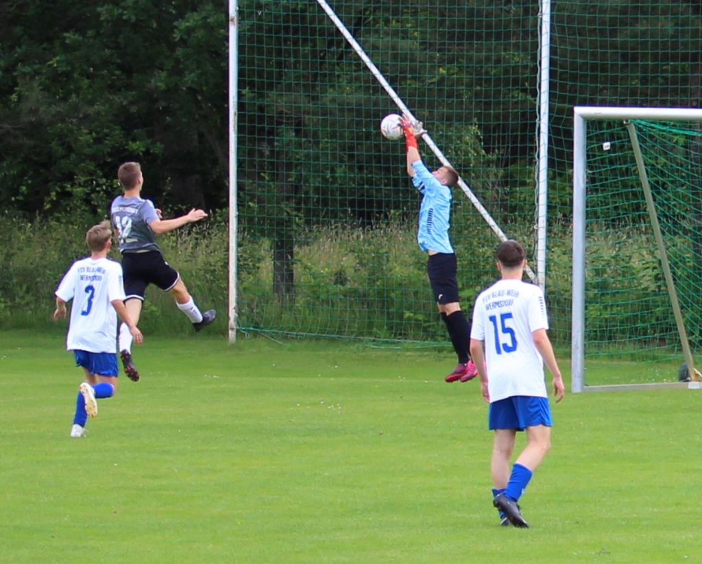 Tim Frölich im Luppaer Kasten mit einer starken Leistung – Colin-Noel (3) und Elias (15) beobachten die Szene
