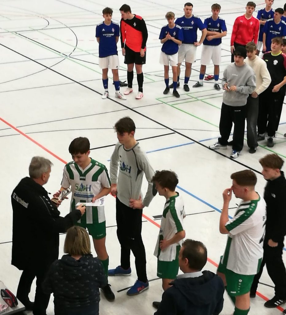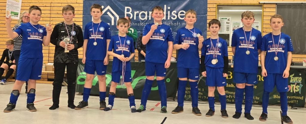 Im anderen Halbfinale spielten die Naunhofer und die Borsdorfer – Naunhof setzte sich durch. Somit stand das Finale fest. In der Gruppenphase spielten wir schon gegen die Naunhofer und unterlagen mit 1:2. Neues Spiel – neues Glück hieß es nun. In einem spannenden Finale spielten beide Teams einen sehr guten Fußball. Am Ende behielten die Naunhofer die Nerven und erzielten den 1:0 Siegestreffer. Somit belegten die Blau-Weißen den 2. Platz und erhielten einen Pokal, Urkunde und Medaillen. Trotz des guten Endergebnisses steht im Training noch viel Arbeit an. Den manche taktischen Dinge, die oft geübt und besprochen wurden, konnten im Turnier nicht umgesetzt werden. Dennoch erspielten sich die Jungs ein starken 2. Platz durch viel Kampfgeist des gesamten Teams. Vielen Dank an dieser Stelle an den mitgereisten Fans, die ihre Schützlinge lautstark anfeuerten. Nico Schindler wurde in das Allstar-Team gewählt und erhielt zur Freude eine zweite Medaille. Nun heißt es im Training nochmal eine Schippe drauflegen. Die Rasensaison ist nicht mehr weit und der Kreispokalendrunde steht in 3 Monaten vor der Tür.