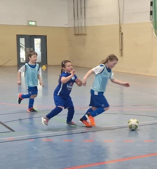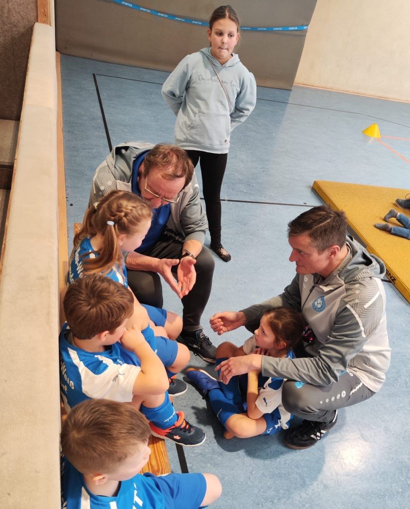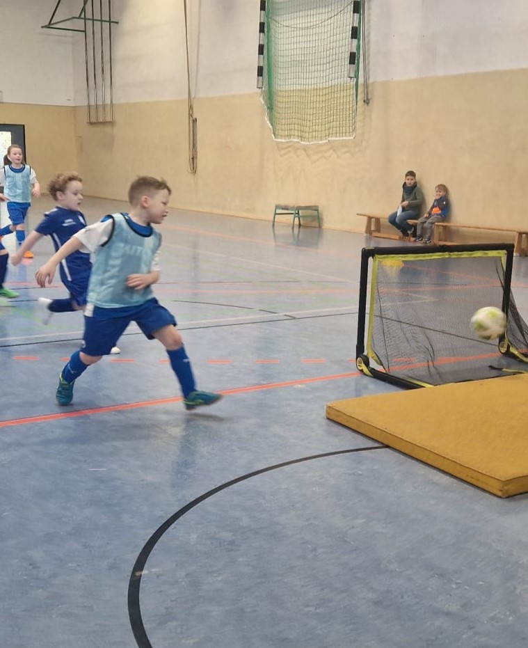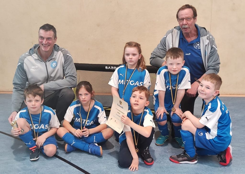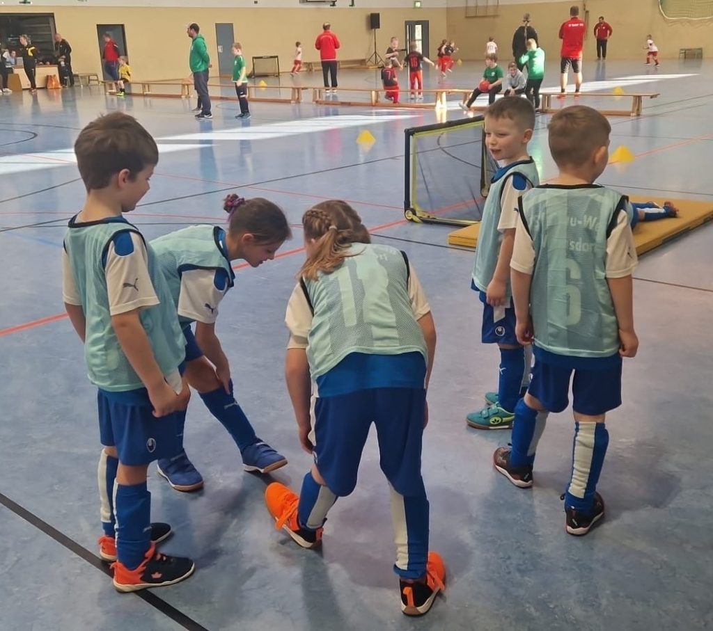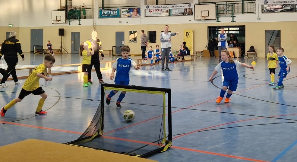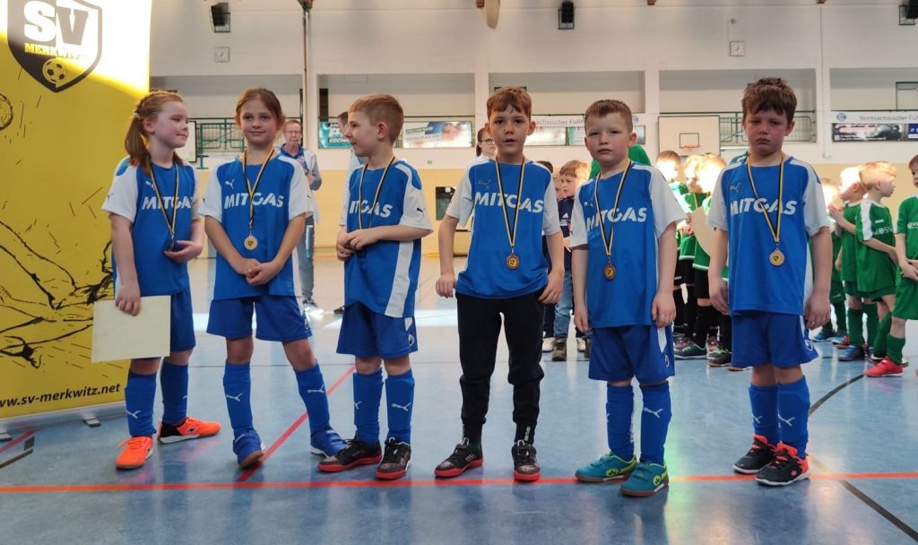 Das finale Wochenende der Merkwitzer Hallencupserie hatte für die jüngsten Hubertusburger die Teilnahme an einem mit 12 teilweise sehr hochkarätigen Teams aus nah und fern besetzten Turniers bereitgehalten. Gespielt wurde mit Vor- und Finalrunde im „Handball-Modus“, das hieß, die erzielten Punkte und Tore aus der Vorrunde gegen die Teilnehmer der Finalrunde wurden mitgenommen. Die Blau-Weißen erwischten in der vermeintlich schwereren Gruppe B einen Start nach Maß und gelangten mit Siegen gegen die Teams aus Torgau, Merkwitz II und Bennewitz in die vorderen Tabellenränge. Die Kritik der Übungsleiter aus den Vorturnieren, den Auftakt verschlafen zu haben, wurde diesmal komplett angenommen.