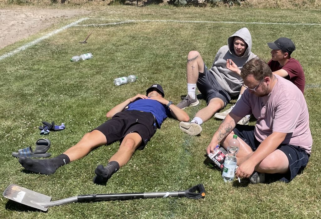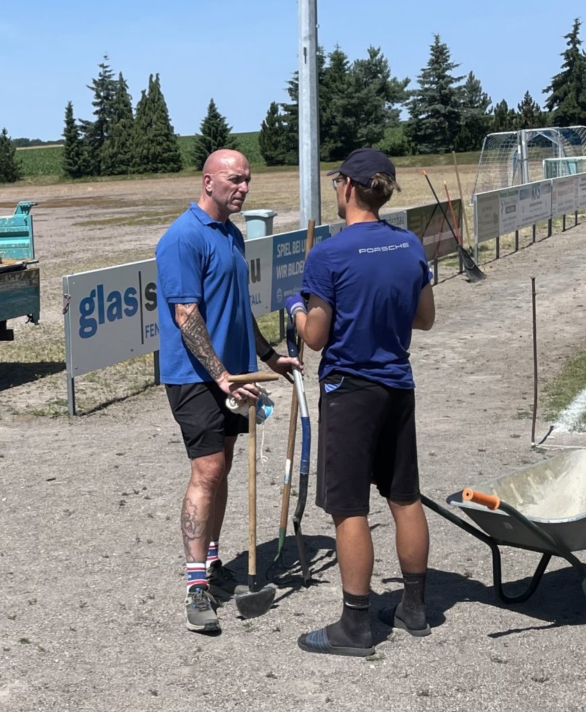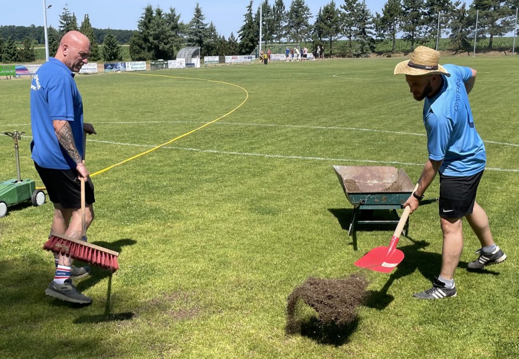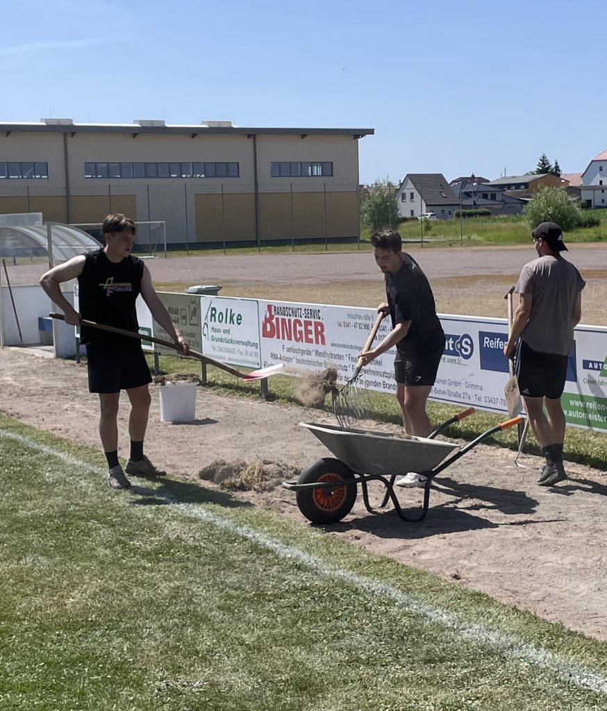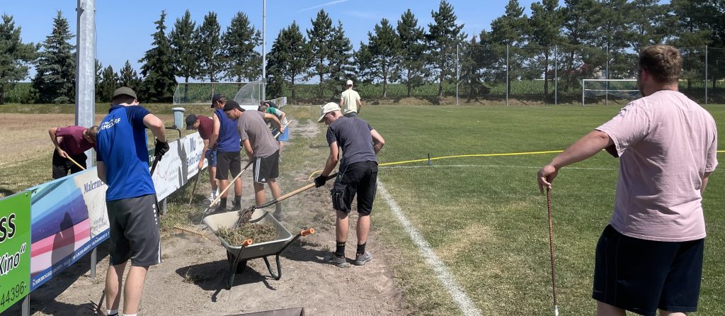 Beim sonntäglichen Arbeitseinsatz am und neben dem heiligen Rasen an der Sachsendorfer Straße waren diesmal 19 Vereinsmitglieder dabei. Bei gefühlten 30 Grad im Schatten wurde die Anlage fit für die neue Saison gemacht. Erfreulicherweise waren viele Vertreter unserer beiden Männermannschaften mit am Start.