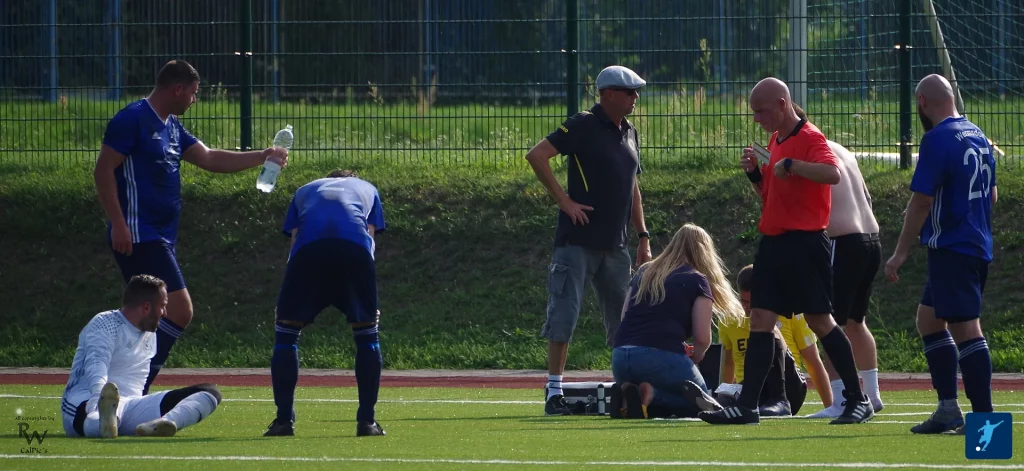Nach der mittlerweile eher weniger als Erfrischung zu bezeichnenden Zusichnehmens von erwärmtem Wasser, geht das blau-weiße Scheibenschießen munter weiter. Hoffmann wird nach schönem Zuspiel von Auerbach im letzten Moment geblockt. Aui wiederrum zieht wenig später aus 20 Metern sehenswert aber erfolglos ab. Für den Oschatzer Andreas Frenkel ist dann leider auch vorzeitig Schluss, als die Kniescheibe rausspringt und der Krankenwagen notwendig wird – Gute Besserung!