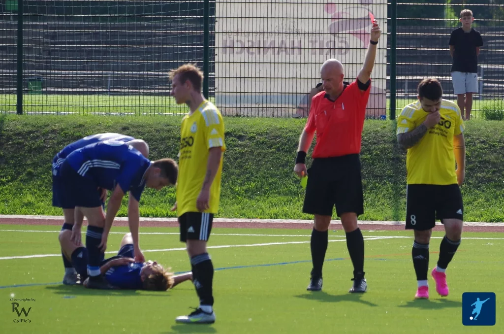 Der Treffer zeigt in jedem Fall Wirkung bei den Kupferlingen, die ins Taumeln geraten. Oschatz drückt in der Folge und Wermsdorf verliert mit der Verletzung von Außenverteidiger Max Thomas auch noch einen Defensiv entscheidenden Faktor. Mit einigem Dusel und viel mannschaftlichem Zusammenhalt überstehen die Mannen von Trainer Dierk Kupfer die schwierigen Minuten bis zum Pausenpfiff und kommen mit den letzten Zügen des ersten Durchgangs sogar nochmal groß auf. Auerbach hat den gegnerischen Schlussmann schon umkurvt, sein Abschluss wird allerdings noch von der Linie gekratzt. Justus Keller trifft nach Standard-Flanke, allerdings wird auf Abseits entschieden. So geht’s leistungsgerecht mit 1:1 in die Pausen. Beide Teams mit ihren Akzenten, ansonsten viel Laufarbeit für Blau-Weiß zwischen den Boxen und willkommener Schatten in der Kabine. Die zweite Halbzeit als Mentalitätsfrage, einen kühlen Kopf bewahren die Aufgabe für die Wermsdorfer Mannschaft. Das misslingt auf der anderen Seite erstmal komplett – Gelb-Rot nach rüdem Foulspiel für den Oschatzer Denis Baranowski in der 53. Spielminute.