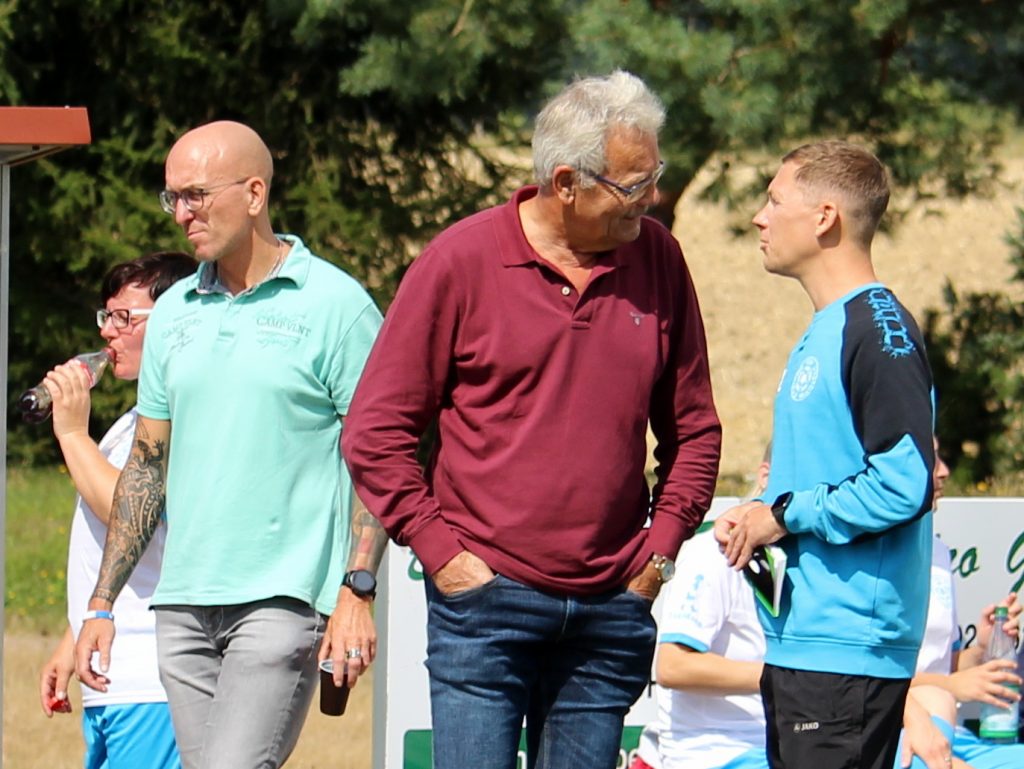 Die favorisierte Elbaue gewann vor 75 Zuschauern mit 6:1. Die Blau-Weißen schafften aber ihr wichtigstes Saisonziel – den Klassenerhalt. Schnappschuss am Spielfeldrand: Dominic Baumann, der sich das Spiel anschaute, mit den Auflaufkindern, sowie Nachwuchscoach Frank Hammer und Vater Rocco Baumann.