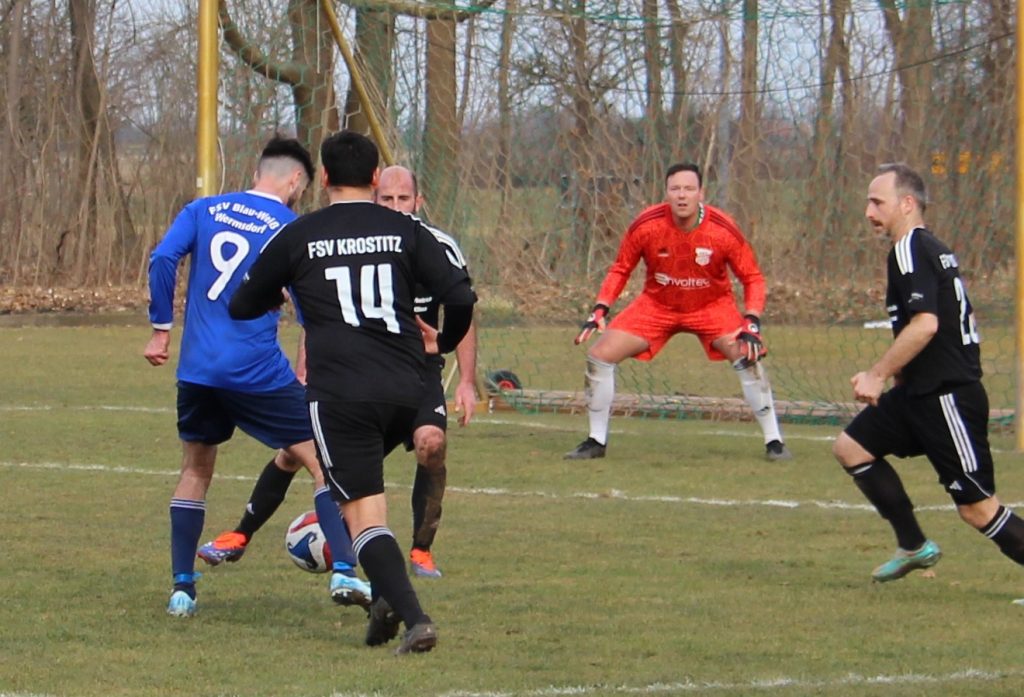 In den ausgehenden Minuten der Partie knallt Krostitz nochmal Kind und Kegel hoch in die Wermsdorfer Box und selbst der Schlussmann versucht im Fünfer die Platte in Szene zu setzen.
