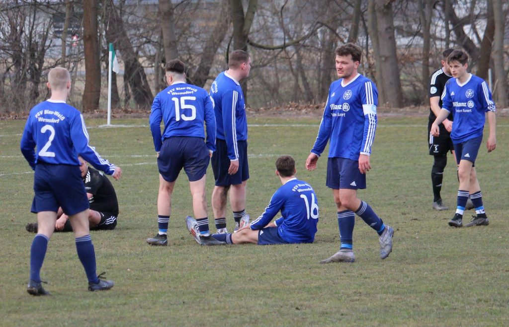 Kurzes Abtasten, klarkommen auf das Geläuf und schon stellte sich in der ersten Hälfte ein tristes Bild ein. Die Hubertusburger von außen durch manch mitgereisten Wermsdorfer, unter anderem eine Kindergeburtstagsrunde aus der F-Jugend, eigentlich tatkräftig unterstützt, finden sich und den Zugang zum Spiel nicht. Die Platzbesitzer sind ohne viel Aufwand in den Zweikämpfen erfolgreicher und eher am Ball, weil Frische und Entschlossenheit in Blau-Weiß fehlen. Gefährlich wird’s vor der FSV-Hütte zwar kaum bis gar nicht, doch auch auf der anderen Seite, der schon einmal durch die Landesklasse umgegrabenen Wiese, sieht es nicht viel besser aus. Nach einem Zufallsprodukt taucht Pascal Weidner frei vorm gegnerischen Kasten auf, kann den Ball jedoch nicht richtig platzieren (17.). Nach Einzelaktionen vergessen kurz darauf sowohl Mamadou „Dudu“ Diallo als auch Louis „Gummi“ Hoffmann den Abschluss. Mit kaum Vertikalität im Spielaufbau und viel zu überhasteten ungenauen weiten Schlägen macht es der Gast den Gastgebern einfach, deren Spiel durchzuziehen und die Null zu halten. Ein Abseitstor der Wermsdorfer wird korrekterweise einkassiert. Kurz vor der Halbzeit kommt nochmal ein Hauch von Durchbruch auf. Justus Keller agiert im Strafraum bei seinem Abschluss nach Vorlage von Gummi allerdings zu hektisch und der aufgerückte Matti Lehmann wird aus spitzem Winkel im Fünfer geblockt. Aber auch vorm blau-weißen Gehäuse kommt mal Gefahr auf als gleich drei Wermsdorfer Mühe mit einem weiten Ball haben, am Ende aber Lukas Schulz im Strafraum allem weiteren zuvorkommt. Torlos geht es also in die Kabine und spätestens nach diesen 45 Minuten ist den Hubertusburgern klar, warum am Fuchsbau schon so manches Team aus dem oberen Tabellendrittel Punkte gelassen hat.