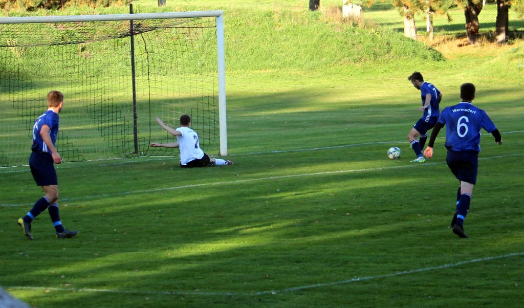 Das aller guten Dinge drei sind, bewies das dynamische Duo dann nur 12 Minuten später. Einen hohen Ball Kellers hinter die Abwehrkette erlief Wermsdorfs Nummer 7, umkurvte den Torwart und schoss das Spielgerät zum entscheidenden 1:4 in die Maschen.