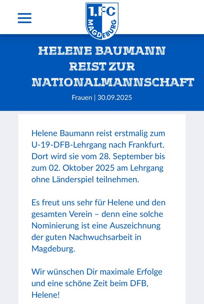 Aufgrund ihrer guten Leistungen erhielt Helene nun eine Berufung zum DFB-Trainingslager der U19 Nationalmannschaft – wir gratulieren und wünschen Helene weiterhin viel Erfolg!