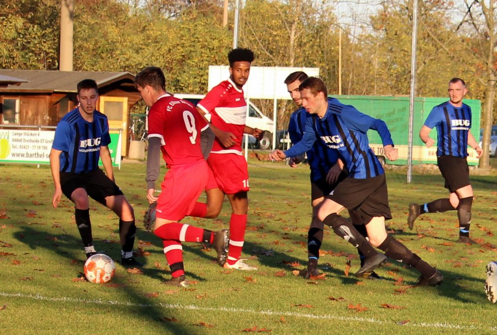 Die Gäste mussten im Waldstadion schon nach einer viertel Stunde Spielzeit umbauen. Florian Grieser hatte sich heftig an der Schulter verletzt – gute Besserung an dieser Stelle. Die Männer des Trainerduos Wogawa/Hanisch spielten konzentriert nach vorn, hatten allerdings zunächst wenig Glück beim Abschluss. Die Elbaue igelte sich auf eigenem Platz nicht ein und beschäftigte die Gästedefensive bei gelegentlichen Kontern – ansonsten zu viel Palaver über und mit dem Schiedsrichter Berger.