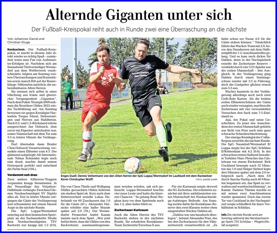 Die etwa 60 Zuschauer hatten ihren Spaß an dieser unterhaltsamen Partie. Rackwitz stellte zwar auf 0:2 durch Alexander Heinicke – René Stephan verkürzte kurz vor dem Spielende auf 1:2. Am Ende bleib es beim schmeichelhaften Weiterkommen des Nordsachsenligisten gegen spielstarke Oldies, die auch in den letzten Minuten konditionell mithielten.