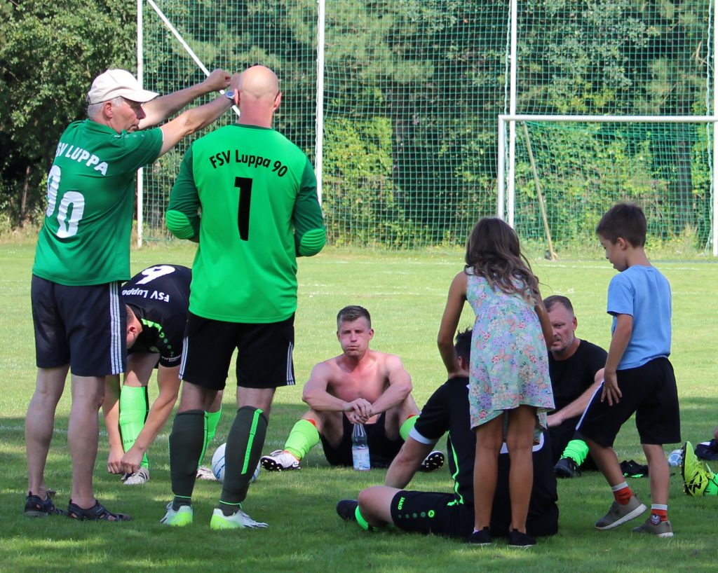 Beide Überlegungen gingen auf und die Oldies übernahmen mehr und mehr die Initiative. Erste Chancen wurden vergeben. In der 65. Minute war es dann soweit. Mücke behauptete in der gegnerischen Box den Ball. Eine kurze Drehung um den Verteidiger – Flachschuss – 1:2. Weiter ging es in Richtung Gästetor: 73. Minute – Freistoß an der Wölkauer Box. Carsten Rademacher legte sich das Kunstleder zurecht – 2:2. 80. Minute – Schiedsrichter Kai Oehmigen zeigte nach einem Handspiel auf den Strafstoßunkt der Wölkauer. Radi lief an – der Hüter lenkte den Ball an den Pfosten – Radi im Nachsetzen – 3:2. Nun warfen die Gäste alles nach vorn und konnten in der 84. Minute über den Ausgleich jubeln – Abpfiff und Verlängerung. Hier mussten beide Mannschaften der Hitze und dem Tempo Tribut zollen – das Spiel fand weitestgehend zwischen den Boxen statt. Die eine oder andere halbgare Chance brachte kein Tor aus dem Spiel heraus. Die Entscheidung musste also über das Elfmeterschießen fallen. Hier waren die Gäste letztendlich abgezockter und setzten sich mit 4:2 durch. Glückwunsch an den SV Wölkau zum Weiterkommen aber auch Dank an unsere Oldies für dieses spannende und mitreißende Pokalspiel.