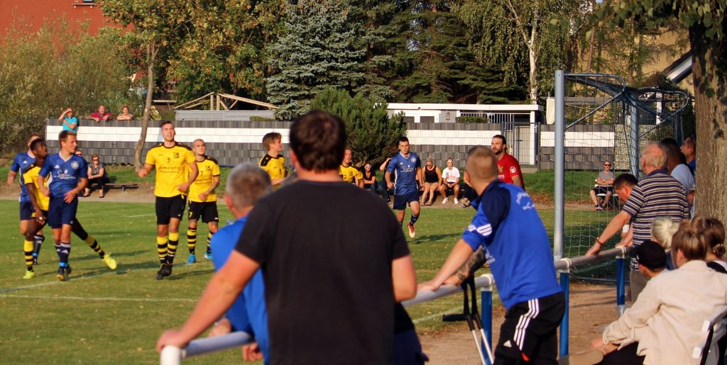 Keine drei Zeigerumdrehungen sind durch, da bedient Pascal Weidner genial Stürmer Robby Staude, dem sich die frühe Topchance bietet. Die Nummer 25 geht entschlossen in den Abschluss, scheitert aber am gut reagierenden Florian Groß, der unter Beweis stellt warum er vor einigen Jahren bei RB Leipzig zwischen den Pfosten stand. Die schnelle Überraschung zwar nicht geglückt, aber Wermsdorf umgehend mit dem Fingerzeig aufs eigene Selbstvertrauen und neue Selbstverständnis in Blau-Weiß. Radefeld von den beherzt ackernden und geschlossen auftretenden Mannen um Kapitän Benjamin Schönitz sichtlich beeindruckt, zunächst ohne Idee wie den Hubertusburgern beizukommen ist. So spielt sich das Geschehen vornehmlich zwischen den Boxen am, wobei der Gast zwar viel mit Ball agiert, die Gastgeber aber in jeder Situation griffiger wirken. Dafür Bände spricht die gefühlte Foulstatistik der Anfangsphase, in welcher tatsächlich ein so nicht stereotyper Eindruck von Stadt und Dorfniveau entsteht. Allen voran Sebastian Körner auf der FSV Sechs im Schlüsselduell mit SV Stürmer Silla in der ersten halben Stunde mit einer beeindruckenden Vorstellung, bietet dem im Vorfeld von allen Seiten Hochgelobten grandios Paroli und führt so den Defensivverbund seiner Farben an. Das gibt den Vorderleuten die Möglichkeit höher anzulaufen und Tempogegenstöße zu generieren.