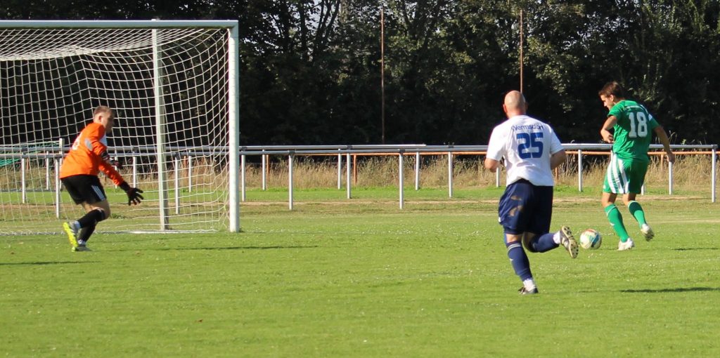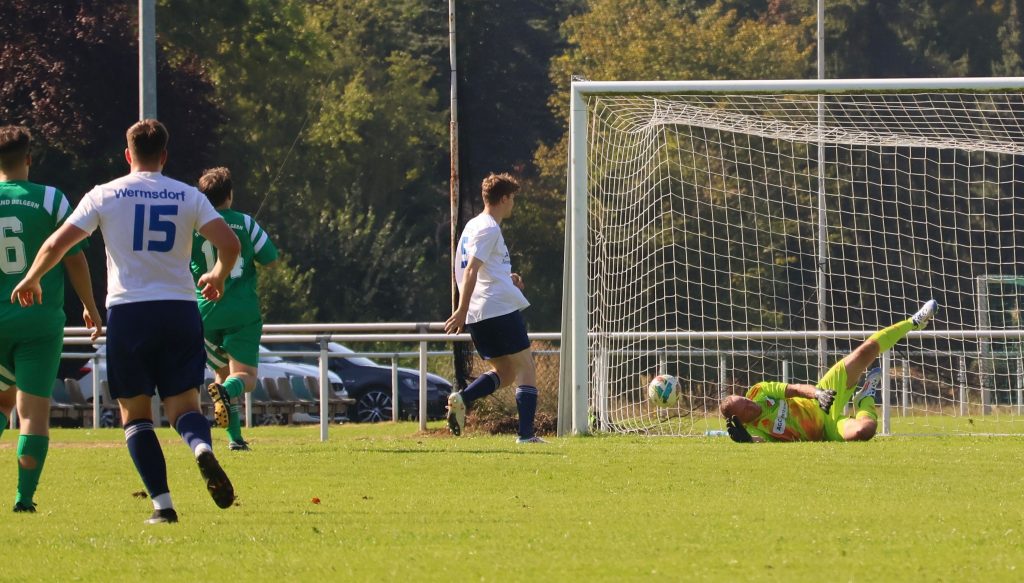 Zurück unter der sengenden Hitze Rolands geht es wieder los, wie schon gesehen. Wermsdorf klebt noch irgendwo zwischen Schatten und Licht und vergurkt die Anfangsphase beinahe erneut. Nach einem FSV-Pfostentreffer kann von Verteidigung keine Rede sein und Belgern ist auf und davon. Tatsächlich vollbringen die Platzbesitzer aber das Kunststück, zum zweiten Mal an diesem Tag aus nächster Nähe an den verwaisten Torstangen vorbeizuschieben.