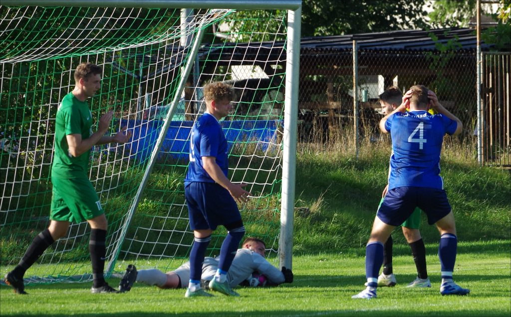 Jetzt wird’s zäh für die Schützlinge von Trainer Dierk Kupfer, aber noch ist genug Zeit auf der Uhr. Für den angeknacksten Keller übernimmt Libero Denny Beckedahl die Rolle als Wortführer und treibt seine Farben nochmal an. Wermsdorf will und kämpft. Beckedahl nach 67. Spielminuten mit der der Lösung. Der Freistoßspezialist schaltet beim ruhenden Ball schnell und bedient den ebenfalls hellwachen Oscar Kupfer auf dem verwaisten rechten Flügel. Der Außenbahnspieler zieht auf und nach innen, schließt ab Richtung zweiten Pfosten. Dort klatscht das Streitobjekt an den Pfosten und der eingrätschende Pascal Ziegler drückt den Fisch schließlich ins Brötchen. Denken zumindest 24 Leute auf dem Platz. Aus dem Nichts und zum blau-weißen Entsetzen geht die Fahne hoch. Erst soll Osse im Abseits gestanden haben, dann wird sich nochmal auf Calle als Übeltäter korrigiert. Aller FSV-Protest nützt natürlich nichts, die Entscheidung vom Schiedsrichter steht und es weiter. Aus der Ernüchterung wird in der Folge noch Drama, Fassungslosigkeit und Wut. Erst wird Louis Hoffmann im Strafraum so weggeknallt, dass man wohl selbst auf dem heimischen Jubiläumsfest in Mahlis davon gehört hat – die Folge: Spielfortsetzung. Dann wird es noch bitterer. Mit Robby Staude patzt der nächste Wermsdorfer Führungsspieler und es klingelt zum 3:1 (78.). Schließlich scheppert es auf der anderen Seite zur vollkommenen Sinfonie abermals, als der eingewechselte Ruven Frase beim Durchmarsch im Strafraum vom gegnerischen Schlussmann komplett über den Haufen gekachelt wird – die Folge diesmal: gelb und Freistoß. Lamentieren wieder zwecklos, Wermsdorf mittlerweile eh zunehmend mit sich selbst beschäftigt. Becke tritt das Spielgerät wuchtig. Pascal Weidner trifft den Rebound aus der Drehung leider nicht ganz sauber und so findet das Geschehen spät sein endgültiges Sinnbild, als die Nummer 4 die Arme verzweifelt über dem Kopf zusammenschlägt.