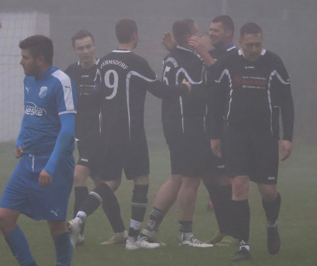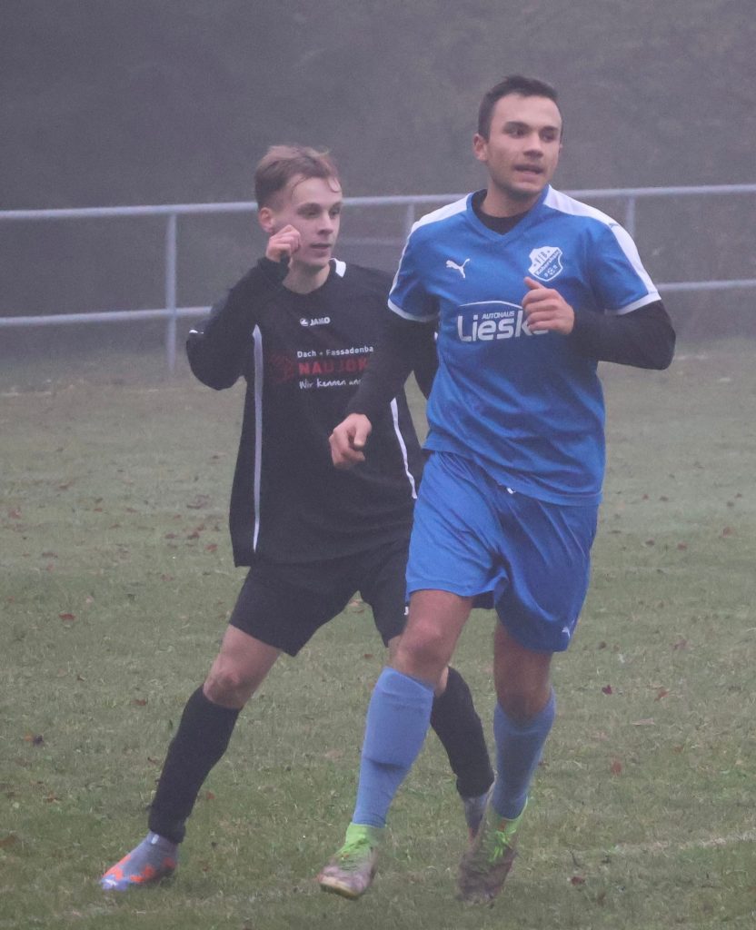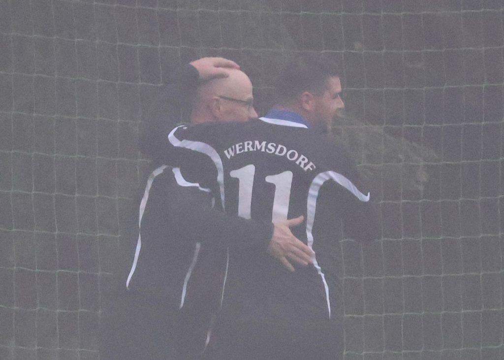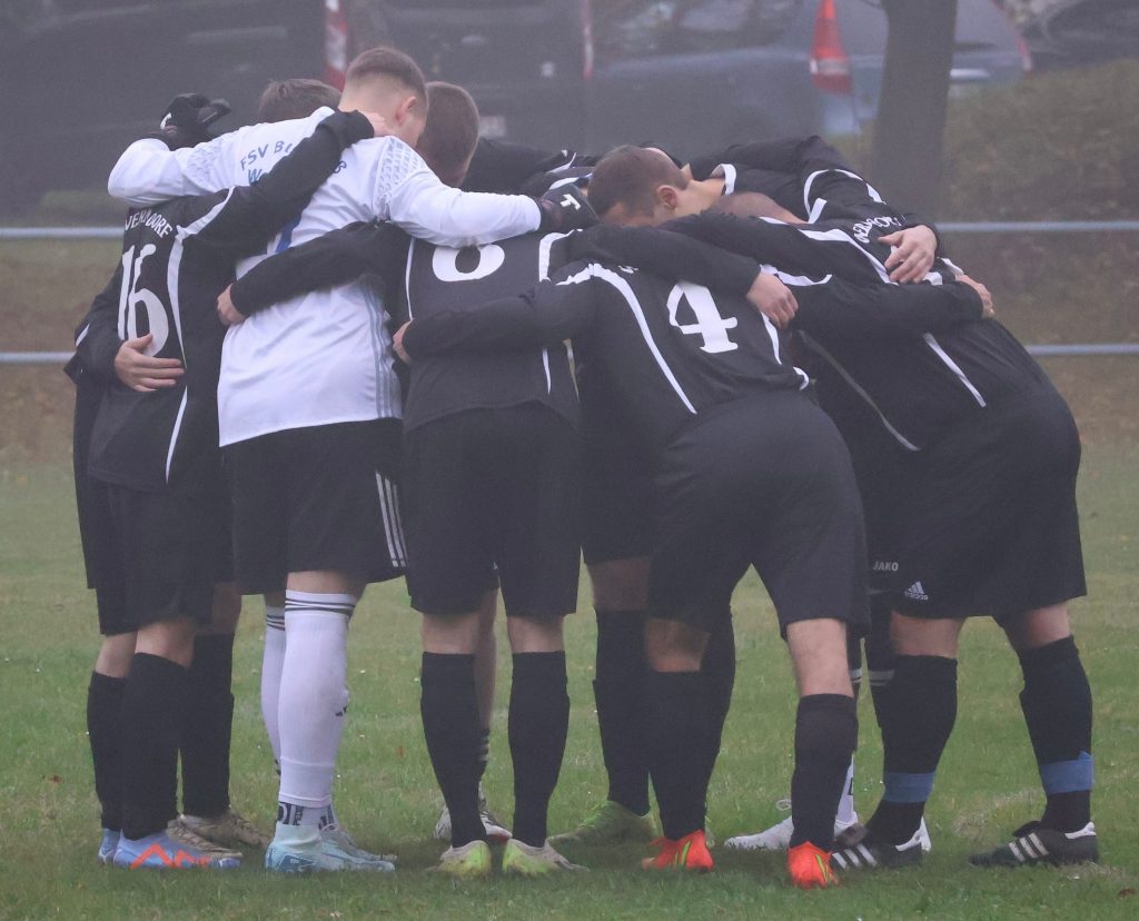 Der Platz nass und neblig, was dem Namen „Höllengrund“ durchaus entsprach. In der Kabine gab es Motivationsansagen der Trainer und vom Kapitän Kevin Schmidt. In der ersten Hälfte war das Spiel sehr ausgeglichen, sichere Torchancen blieben beidseits aus. In der 20. Minute hatten unsere Gegner durch einen Freistoß aus 20 Metern Entfernung ihre erste gefährliche Situation. Der Ball knallte an die Latte. Keeper Max Wiedner holte sich den Abpraller. Das umkämpfte Spiel waberte zwischen den Boxen. Kurz vor der Pause ein taktischer Doppelwechsel. Die Oldies Vetti und Andy kamen auf den Platz. Andy schickte daraufhin Tanker Sascha auf die Reise und dieser knallte den Ball aus 18 Metern ins gegnerische Tor – abdrehen zum gemeinschaftlichen Torjubel.